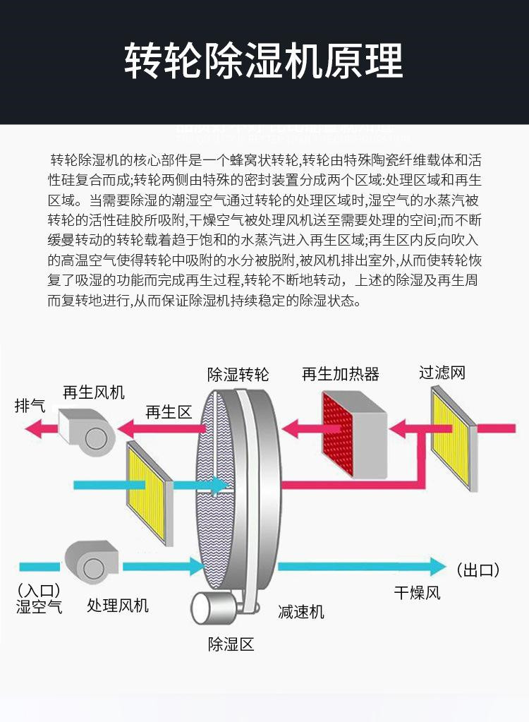 轉輪除濕機的除濕轉輪在隔成除濕區與再生區的箱體內以6-18rph速率作360°圓周運動,需除濕的處理空氣經除濕區時,由除濕轉輪中的吸濕材料吸收空氣中的水份,從而得到干燥空氣;當吸收水份的轉輪區域旋轉至箱體再生區域時,由經再生加熱器加熱后的空氣解吸除濕轉輪吸收的水份排至室外,轉輪吸濕與解吸同時進行,確保除濕機組能夠提的干燥空氣。